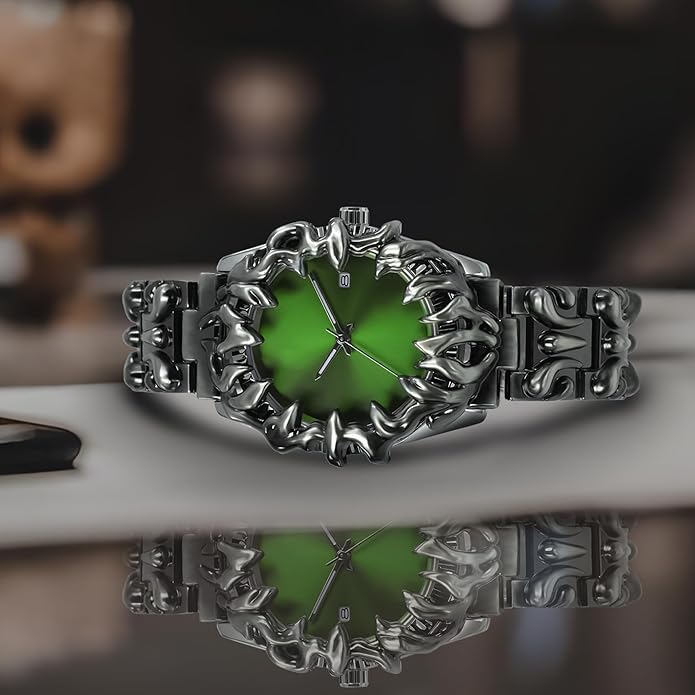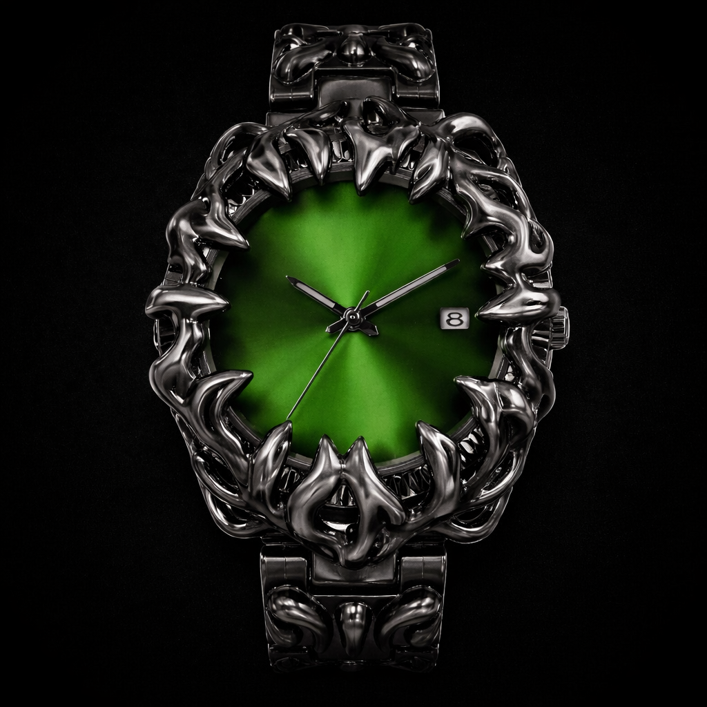 The deep emerald dial glows against the dark metal, creating a sharp contrast that feels both futuristic and occult. Every angle catches light differently, giving the watch a constantly shifting presence on the wrist. 🌑💎