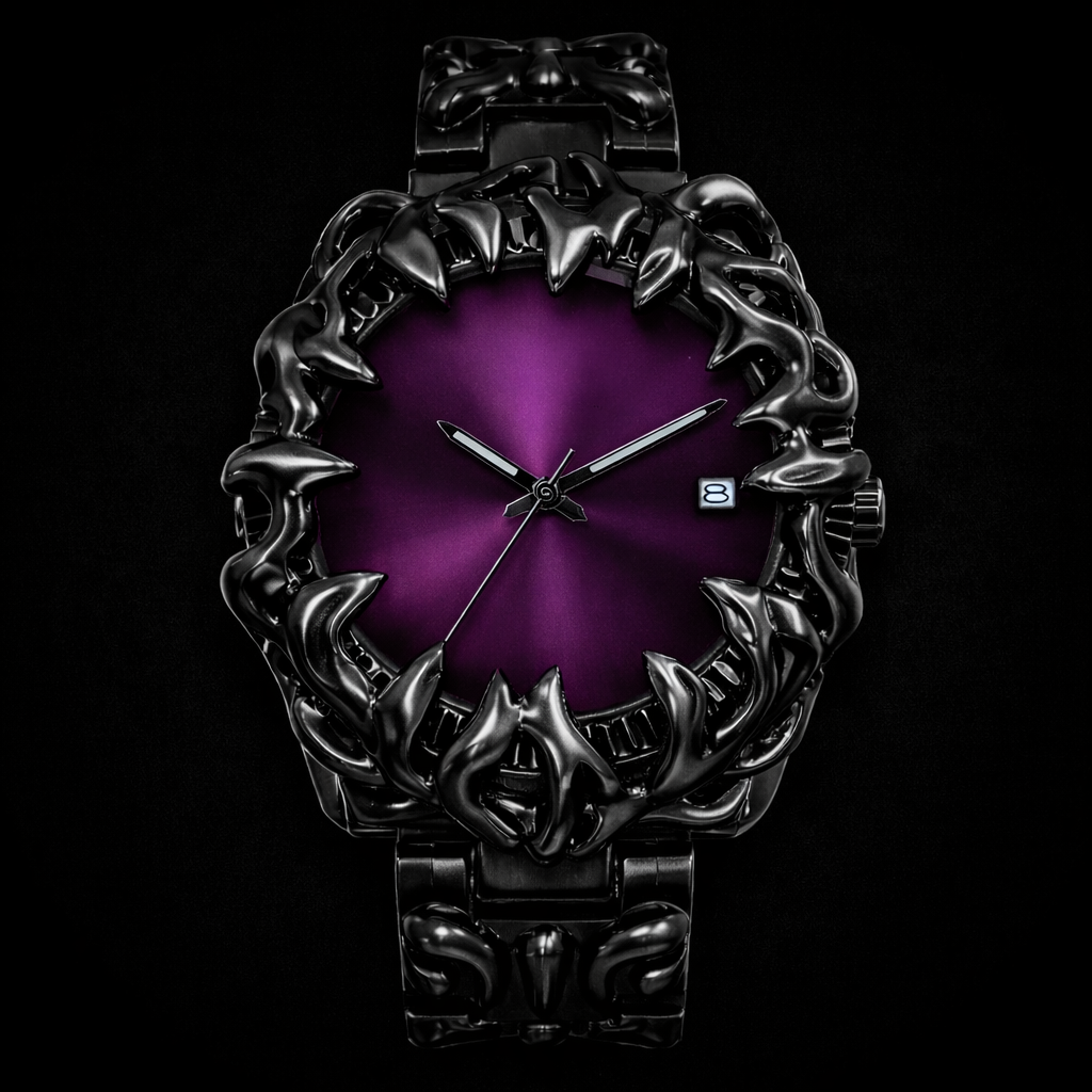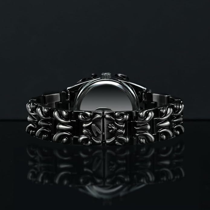 Forged for those who live outside the ordinary. ⚔️🖤 This gothic-inspired watch features an aggressive, liquid-metal design that wraps the case and band in a sculpted, almost symbiotic form. The polished black alloy looks alive—twisted, armored, and unapologetically bold. 🖤🔥